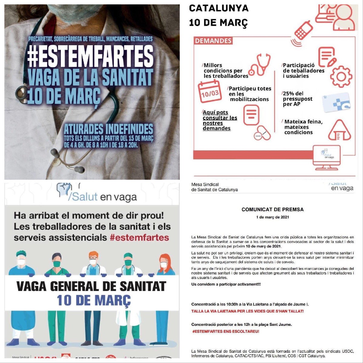 Convoquen vaga del sector sanitari i de serveis el 10 de març en contra de la precarització del sistema. L'aturada està impulsada per CGT, USOC, Infermeres de Catalunya, CATAC/CTS/IAC, PSI Lluitem i COS