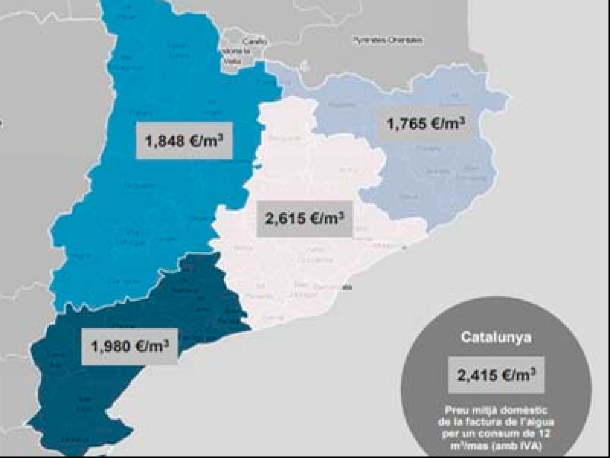 El preu mig de l'aigua a Catalunya durant el 2020 ha estat de 2,4 euros/m3 Barcelona és la demarcació amb el preu més alt (2,6 /m3). Lleida, per la seva banda, té un preu mig 1,8 /m3