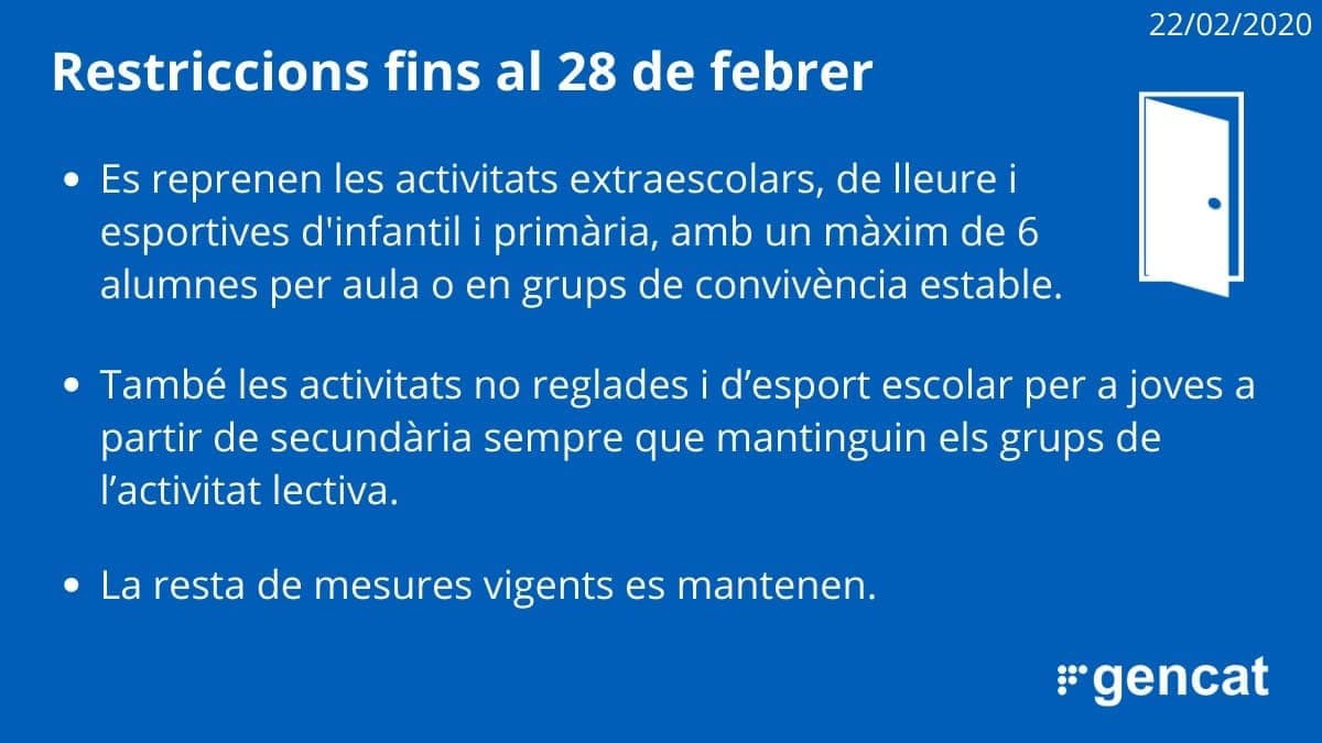 Es prorroguen les restriccions fins al 28 de febrer. Tot i això s'autoritzen les activitats extraescolars infantils. També s' equipara l'esport federat i els consells esportius per poder entrenar amb més de sis persones i participar en les competicions pe