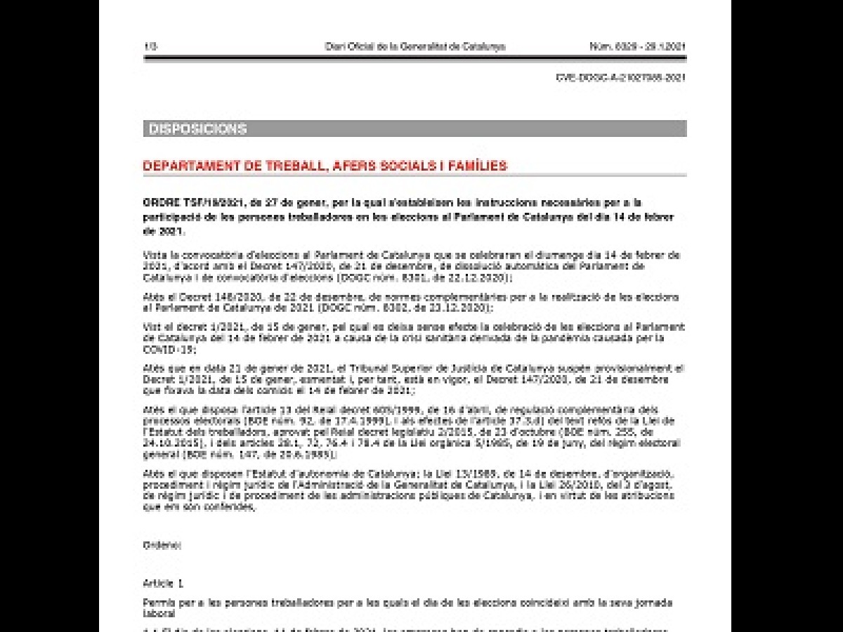 S'estableixen les instruccions per a la participació de les persones que treballin el dia de la jornada electoral del 14-F. El DOGC publica l'ordre que recull el permís de quatre hores que les empreses han de donar als electors i electores que no gaudeixi