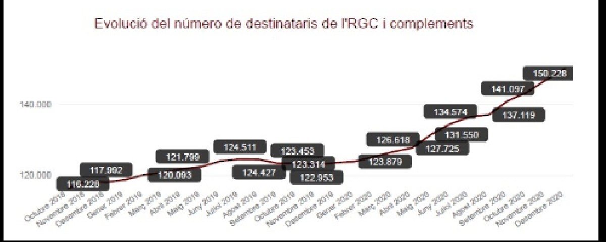 La Renda Garantida de Ciutadania augmenta un 21% els seus beneficiaris. Les dades a desembre de 2020 que es recullen des del Departament i es publiquen trimestralment revelen que la prestació atén a més de 150.000 persones en situació de vulnerabilitat ec