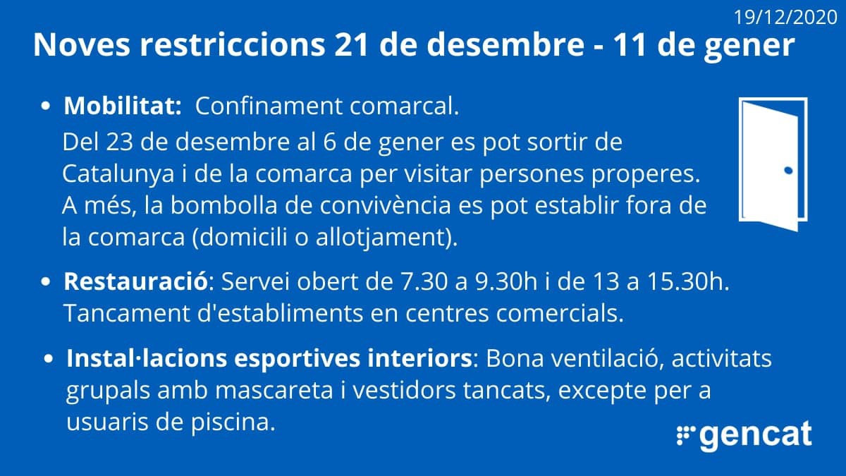 La mobilitat fora de comarca per visitar familiars o gent propera es limita del 23 de desembre al 6 de gener. El DOGC apunta que s'ha de fer mantenint la bombolla de convivència i seguint les mesures de seguretat