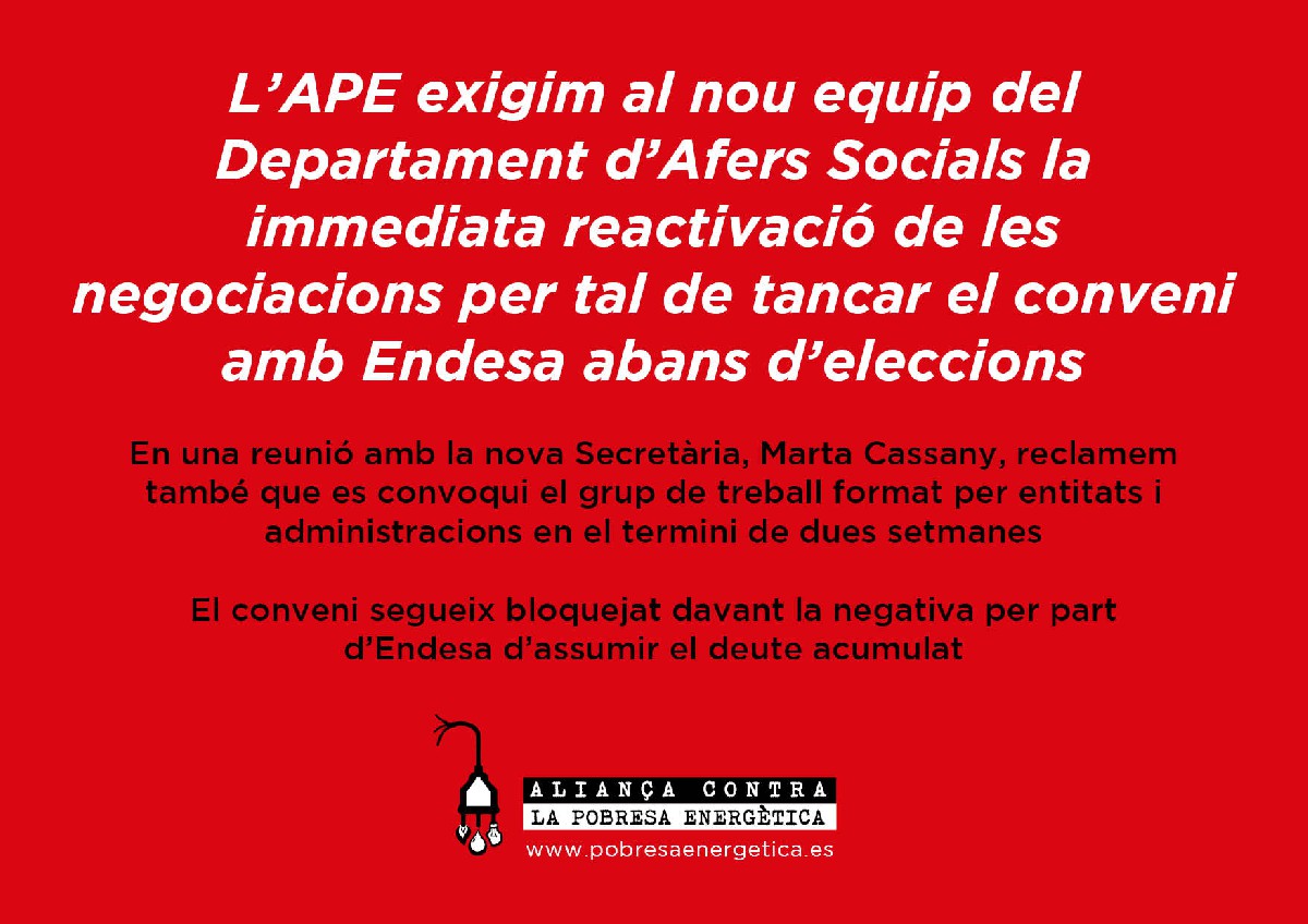 L'Aliança contra la Pobresa Energètica reclama a Afers Socials que reactivi les negociacions amb Endesa per la llei de pobresa energètica abans d'eleccions. Ambdues parts continuen allunyades del pacte per la qüestió del deute acumulat