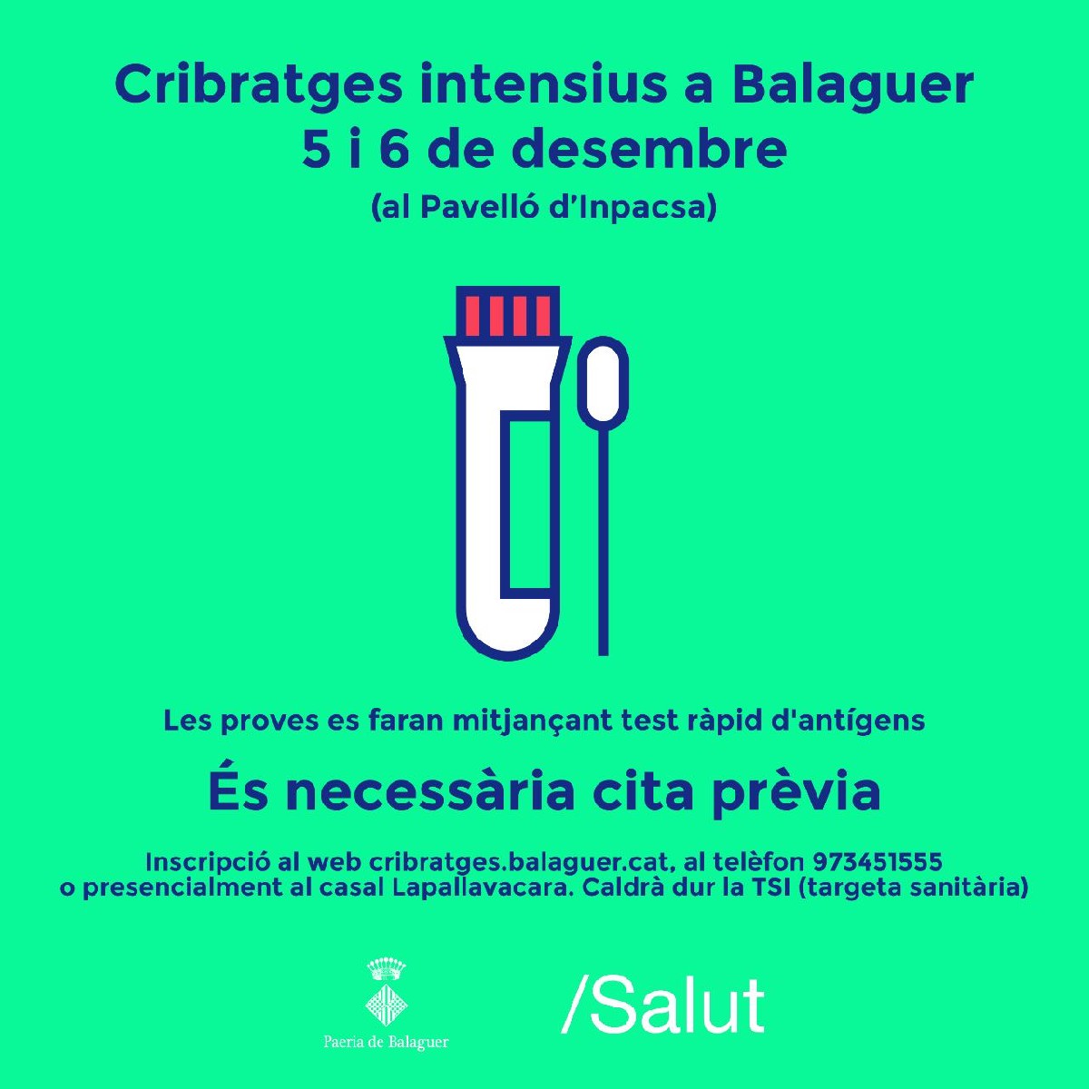 Salut farà un cribratge massiu el proper cap de setmana a Balaguer. Per poder-se fer la prova els interessats s'hauran de registrar prèviament a la Paeria o al web cribratges.balaguer.cat . La prova la poden fer les persones asimptomàtiques majors de 16