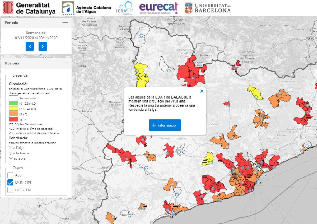 Les aigües residuals confirmen l'evolució creixent de la presència del virus a Catalunya. Una aplicació mostra els resultats setmanals de la presència de restes gèniques del virus a les depuradores