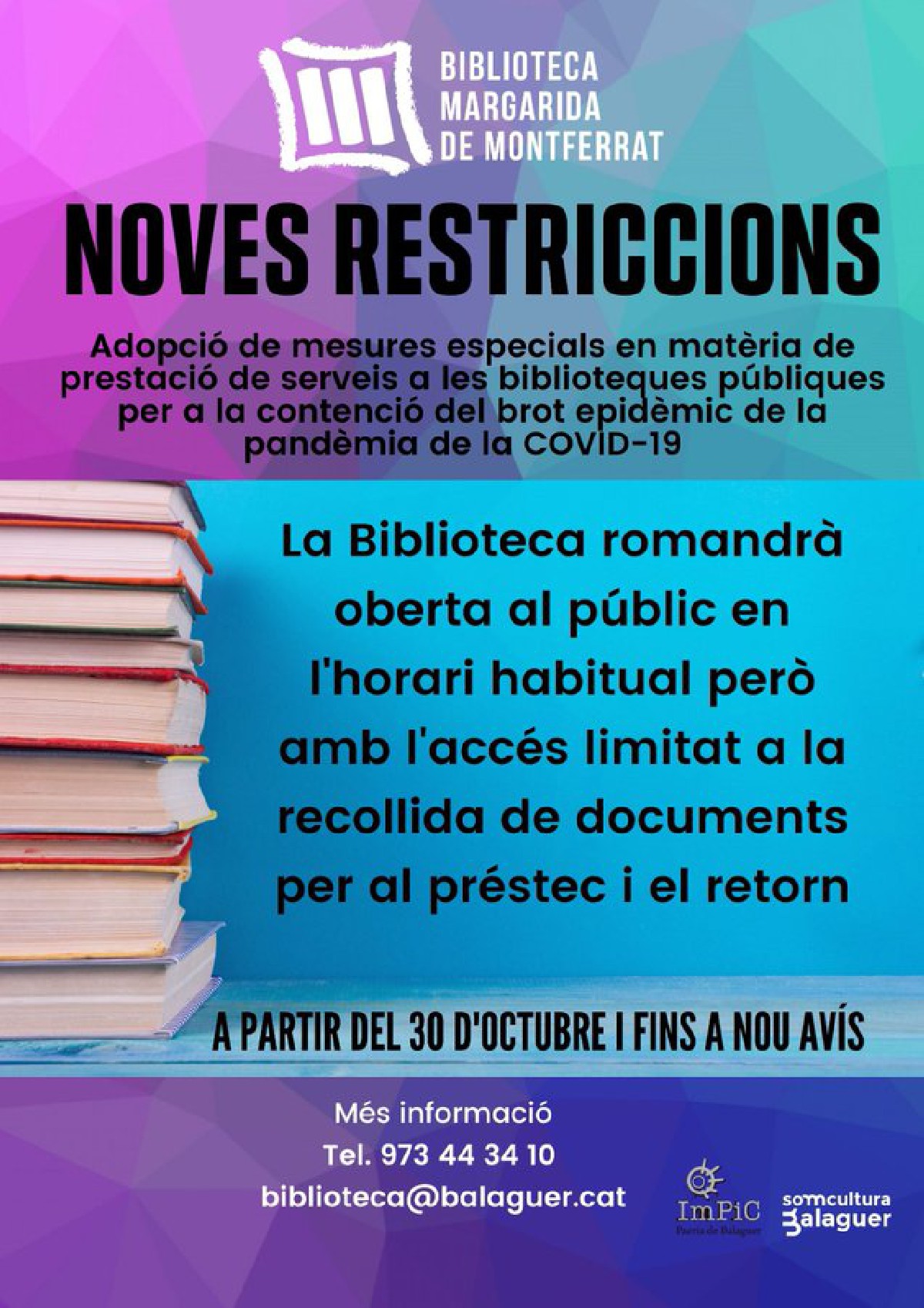 La Biblioteca de Balaguer continua oferint el servei de préstec. Ha habilitat un servei de reserva prèvia per correu electrònic o telèfon. La resta de serveis com l'ús dels ordinadors i les activitats culturals han estat suspeses