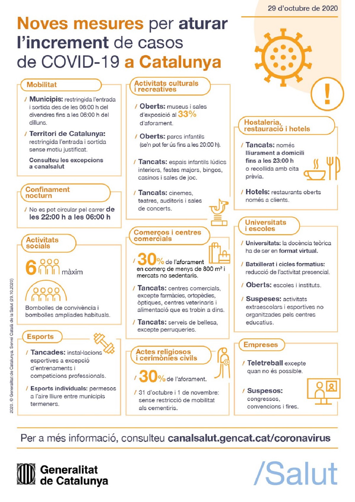 El DOGC publica l'ordre per confinar el perímetre de Catalunya i el dels municipis el cap de setmana. Deixa la restauració tancada i hi afegeix centres comercials, esportius i culturals i activitats extraescolars