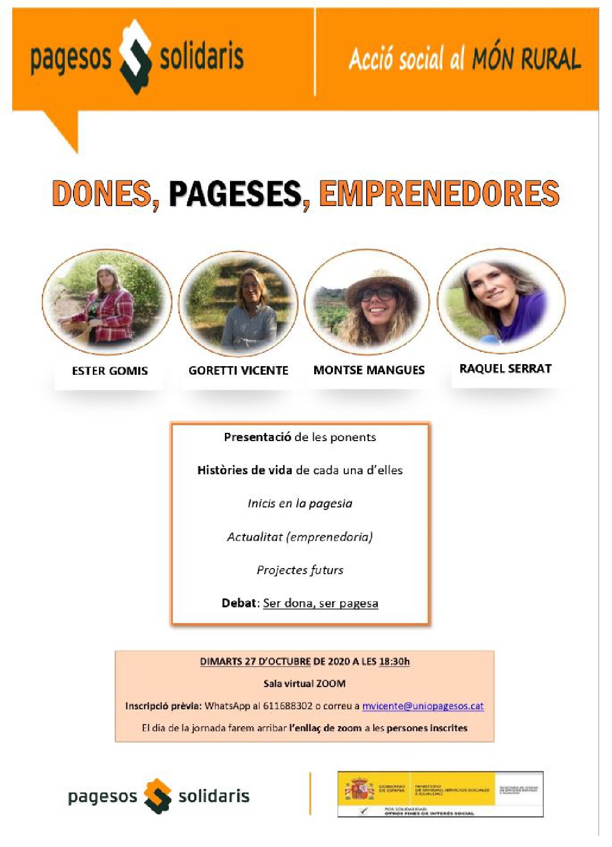 Aquest dimarts, 27 d'octubre a les 18.30h, es durà a terme una jornada-debat sobre DONES, PAGESES, EMPRENEDORES promogut per la Fundació Pagesos Solidaris vinculada al sindicat d'Unió de Pagesos de Catalunya.