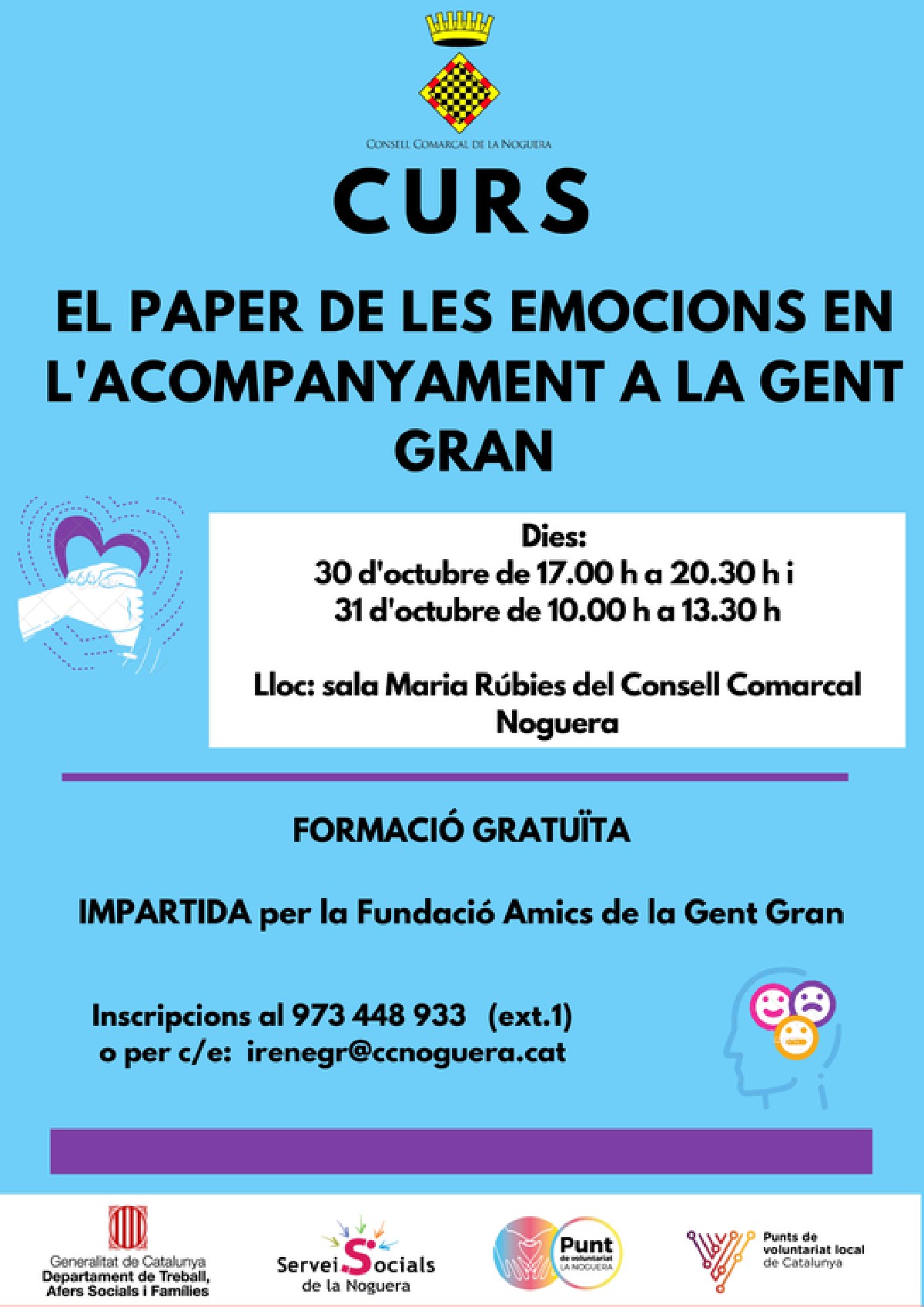 El Consell Comarcal de la Noguera acollirà una nova entrega del curs 'El paper de les emocions en l'acompanyament a la gent gran' després de l'èxit de la primera edició. És gratuït i es farà els dies 30 i 31 d'octubre.