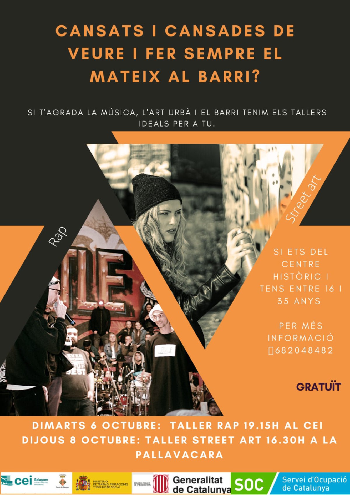Treball als Barris organitza tallers gratuïts de RAP i de STREET ART. El primer es va fer aquest dimarts i aquest dijous tindrà lloc el segon. Estan adreçats a joves residents al centre històric per conèixer noves formes d'expressió artística