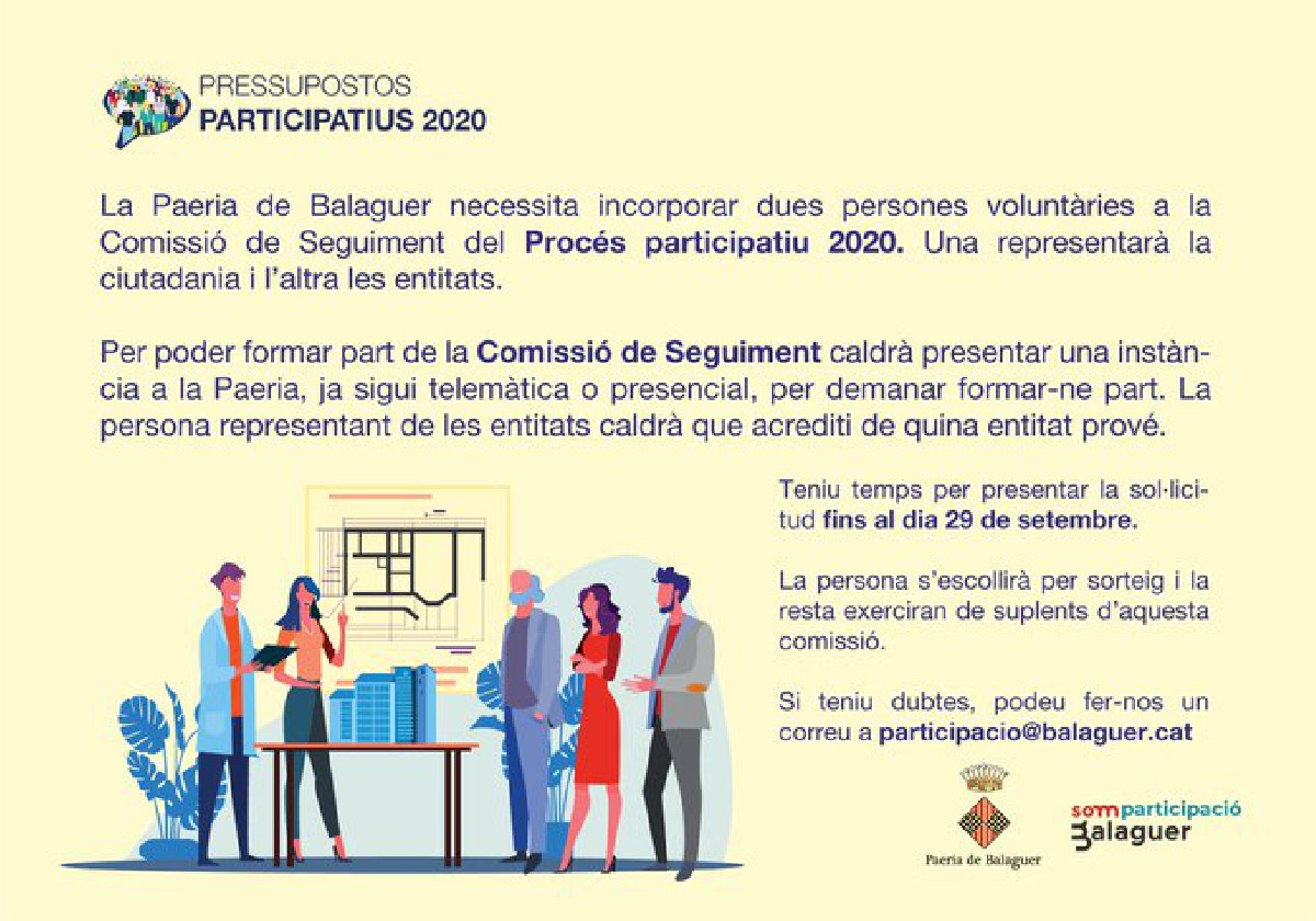 La Paeria de Balaguer fa una crida per incorporar dues persones voluntàries a la Comissió de Seguiment dels pressupostos participatius 2020 que presentarà la setmana que ve i en els que serà la ciutadania qui farà les propostes