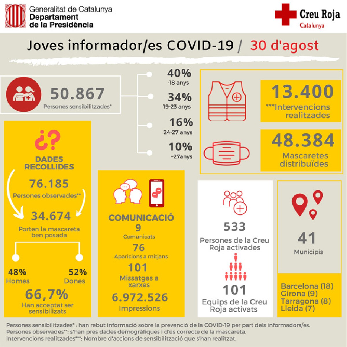 La campanya del Govern i Creu Roja ha sensibilitzat fins ara més de 50 mil joves per prevenir la Covid-19 en l'oci nocturn. A Balaguer s'han sensibilitzat més de 300 joves i s'han entregat prop d'un miler de mascaretes
