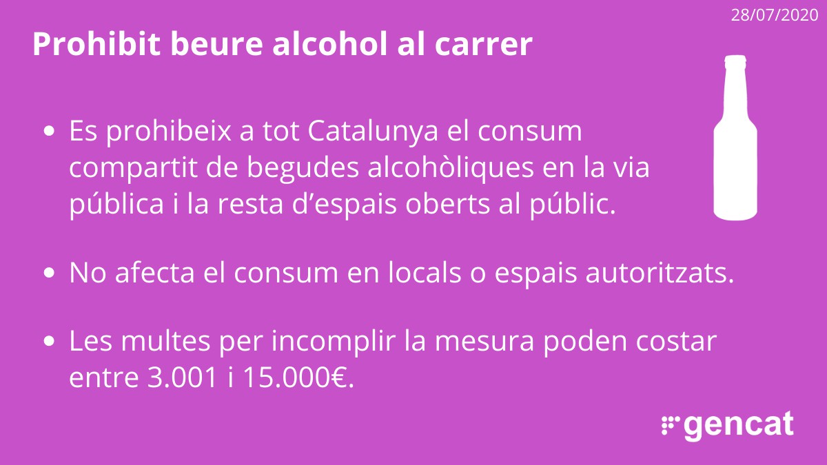 Entra en vigor la prohibició de fer 'botellón' a Catalunya. El DOGC publica la resolució i estableix sancions d'entre 3.001 i 15.000 euros si s'incompleix la mesura.