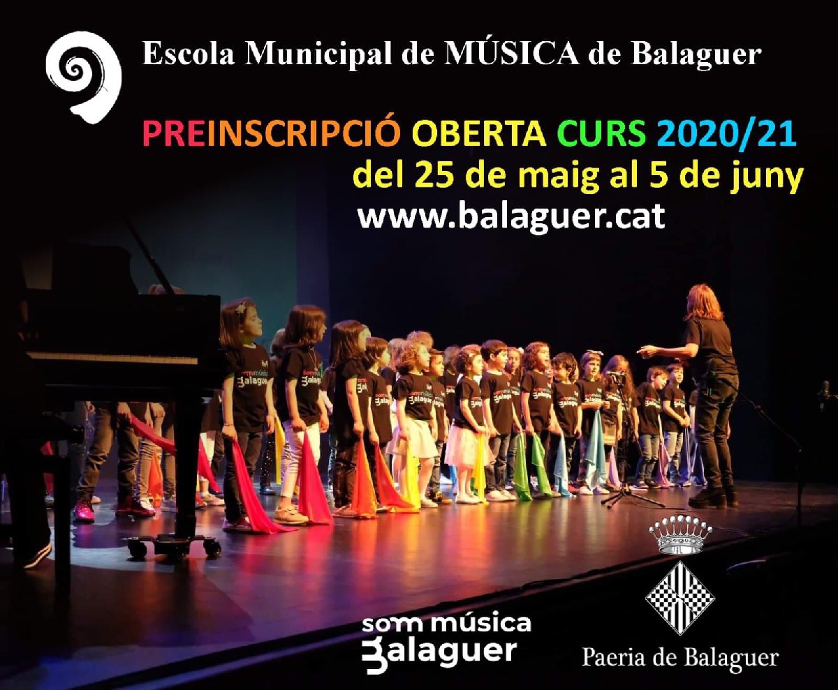 L'Escola Municipal de Música de Balaguer comença aquest dilluns 25 de maig la preinscripció pel curs vinent. Les sol·licituds es poden fer de forma telemàtica a l'oficina virtual de la paeria, on es podrà trobar el formulari de preinscripció.