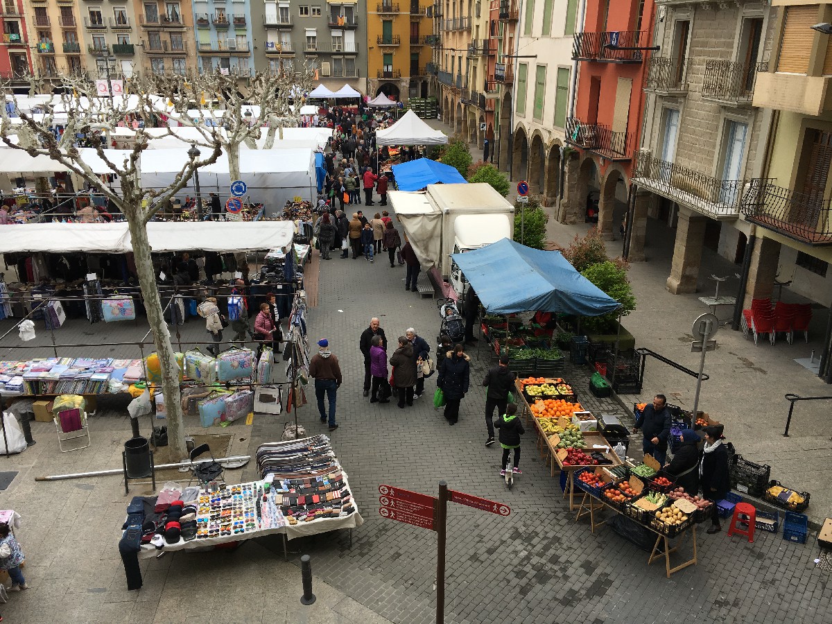 El mercat setmanal de Balaguer es podria redissenyar en un futur per adaptar-se a les noves normes de seguretat si s'allarga la situació de pandèmia actual i poder donar cabuda als paradistes que hi vulguin ser