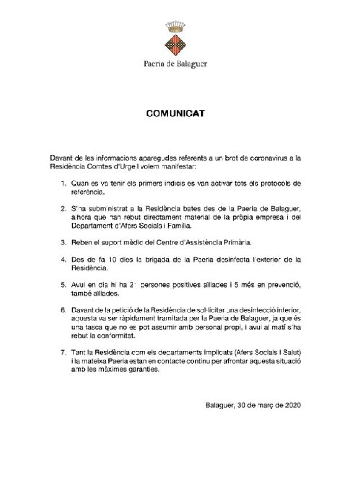 La Paeria de Balaguer emet un comunicat per informar a la ciutadania després de les informacions aparegudes a les xarxes referents a un brot de coronavirus a la Residència Comtes d'Urgell