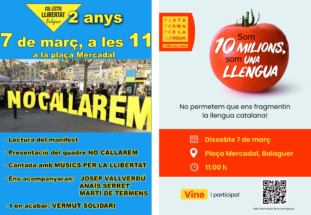 El Col·lectiu Llibertat Balaguer farà aquest dissabte una trobada en motiu dels dos anys de l'inici de les seves reivindicacions. D'altra banda també dissabte la PLATAFORMA PER LA LLENGUA instal·larà un taula informativa.