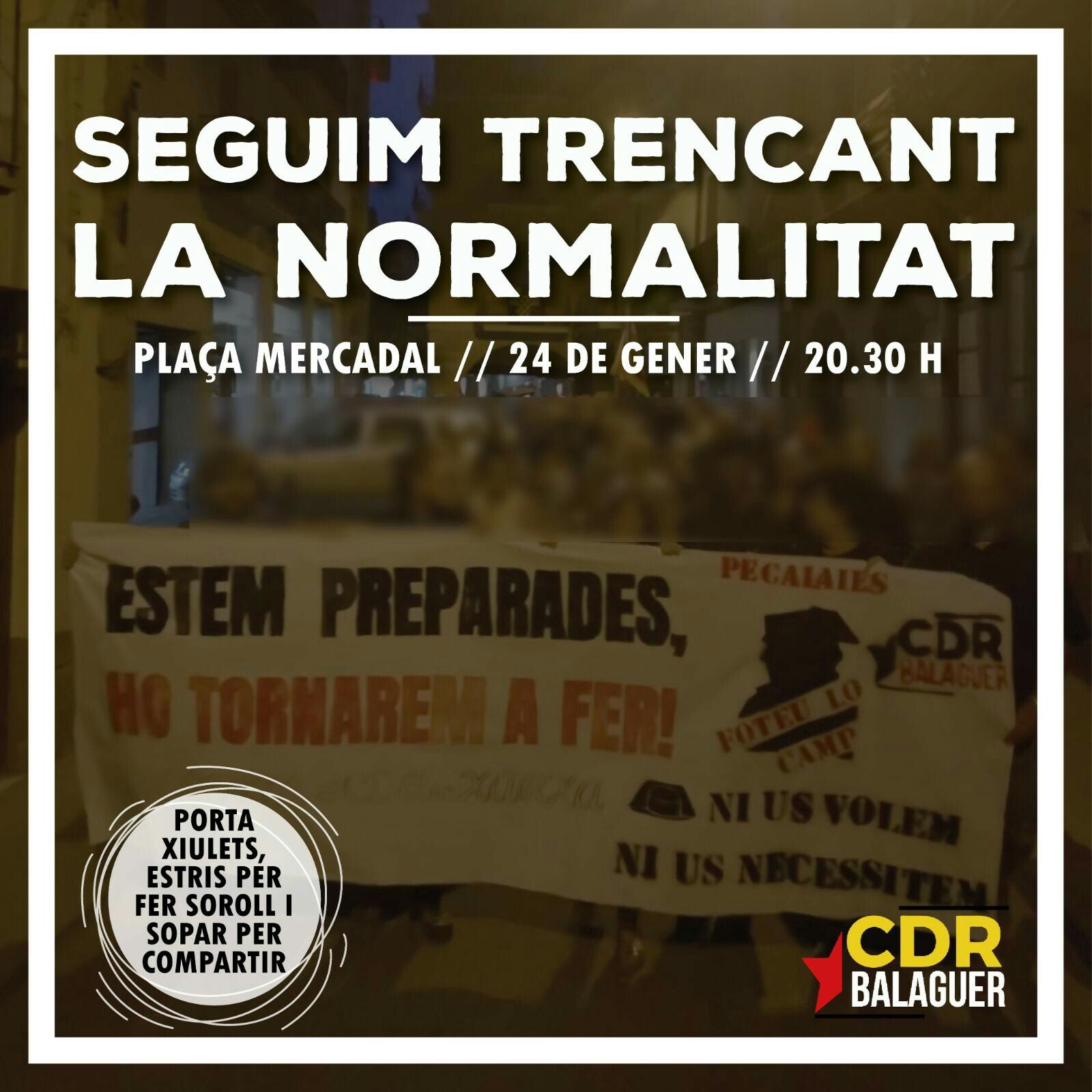 El CDR Balaguer ha preparat una acció aquest divendres a la tarda. Es tracta d'una concentració a la Plaça del Mercadal.