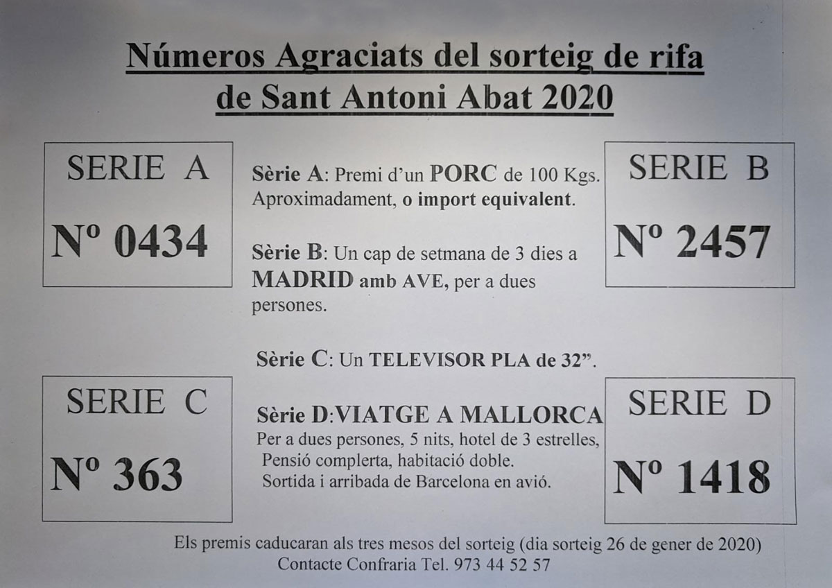 La Confraria de Sant Antoni tanca els actes de la seva festivitat amb el tradicional sopar i rifa del porquet. Els números guanyadors va ser el 0430, el 2457, el 0363 i el 1418.
