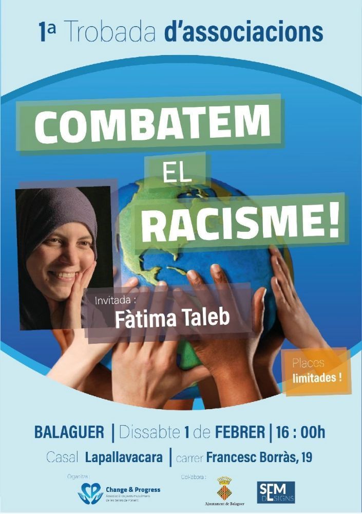 L'associació Change and Progress organitza el dissabte 1 de febrer la trobada d'entitats 'Combatem el racisme' a Balaguer. Comptarà amb la intervenció de la ponent Fàtima Taleb, regidora de l'ajuntament de Badalona.