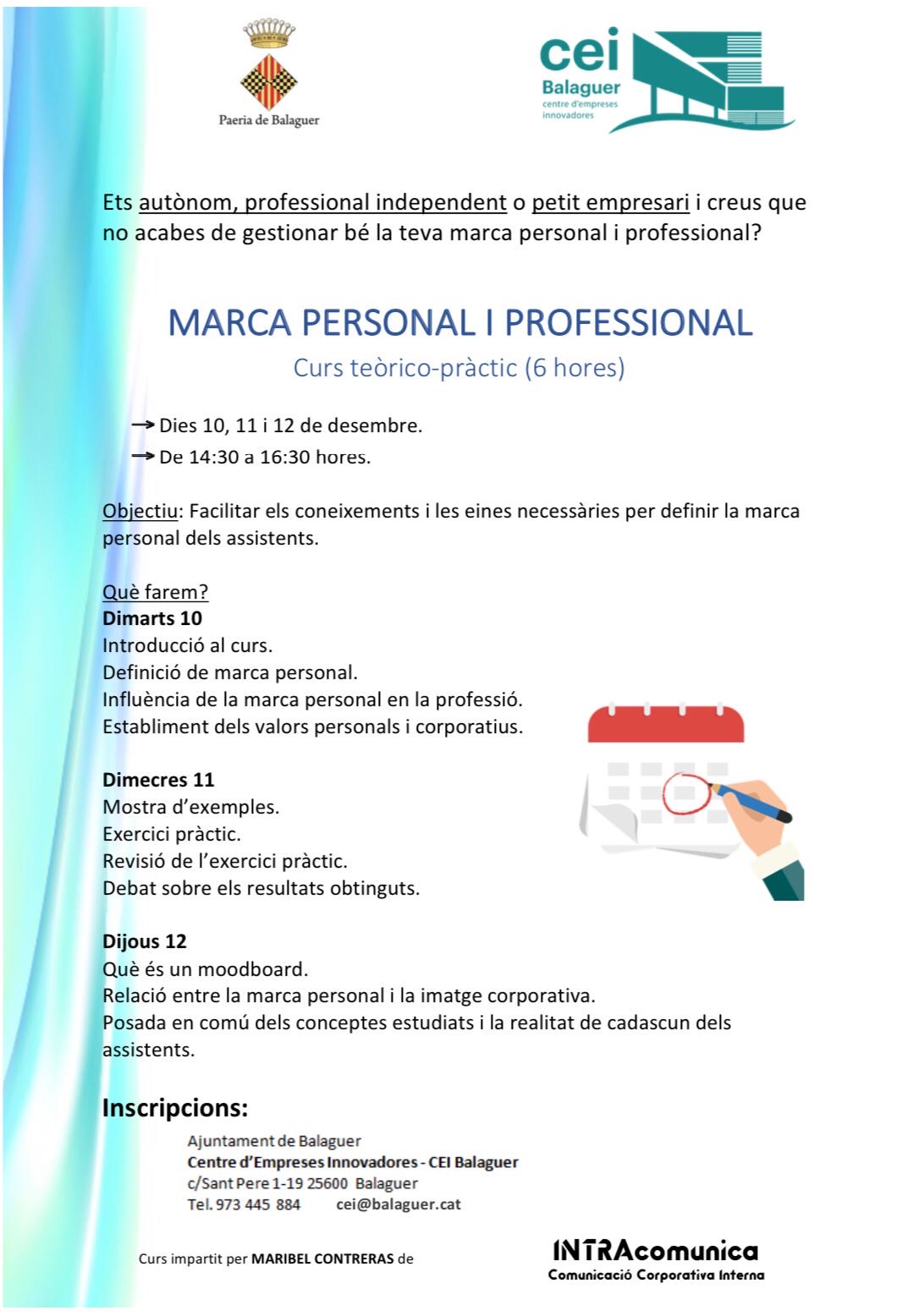 El CEI de Balaguer organitza els dies 10, 11 i 12 de desembre un curs sobre marca personal i professional. El curs serà impartit per Maribel Contreras
