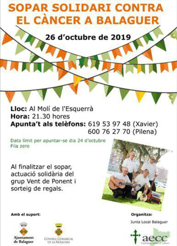 L'associació Contra el Càncer organitza el dissabte 26 d'octubre un Sopar Solidari al pavelló Molí de l'Esquerrà de Balaguer. El termini per apunta-s'hi acaba el dijous 24.