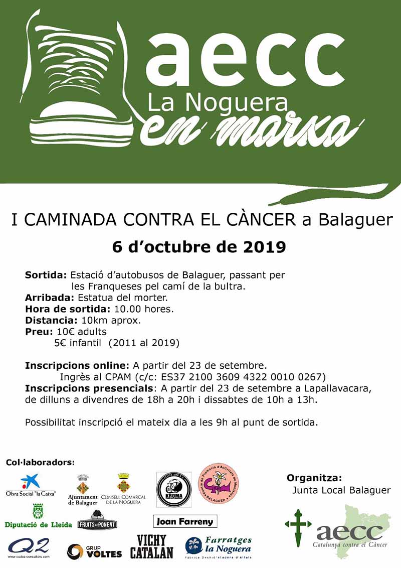 L'Associació Contra el Càncer organitza aquest diumenge la primera Caminada contra el càncer a Balaguer. Tindrà un recorregut de 10 km i la recaptació amb les inscripcions es dedicarà a lluita contra el càncer.