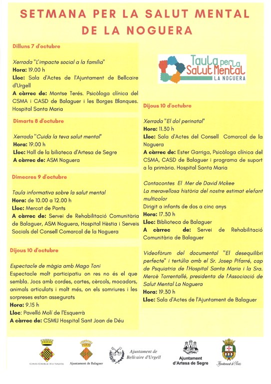 La Taula per la Salut Mental La Noguera prepara tot un seguit d'actes per celebrar la Setmana per la Salut Mental que tindrà lloc del 7 al 10 d'octubre, Dia Mundial de la Salut Mental