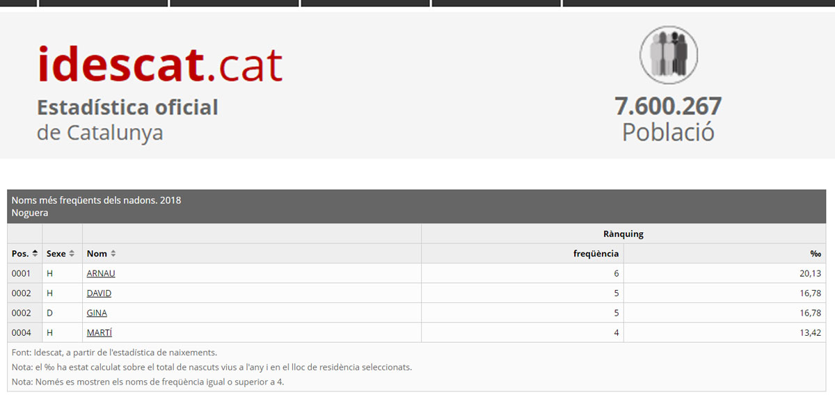 Arnau, David, Gina i Martí són els noms més posats durant l'any 2018 a la comarca de la Noguera. Marc i Júlia continuen sent els noms més freqüents a Catalunya, seguits de Pol i Martina.