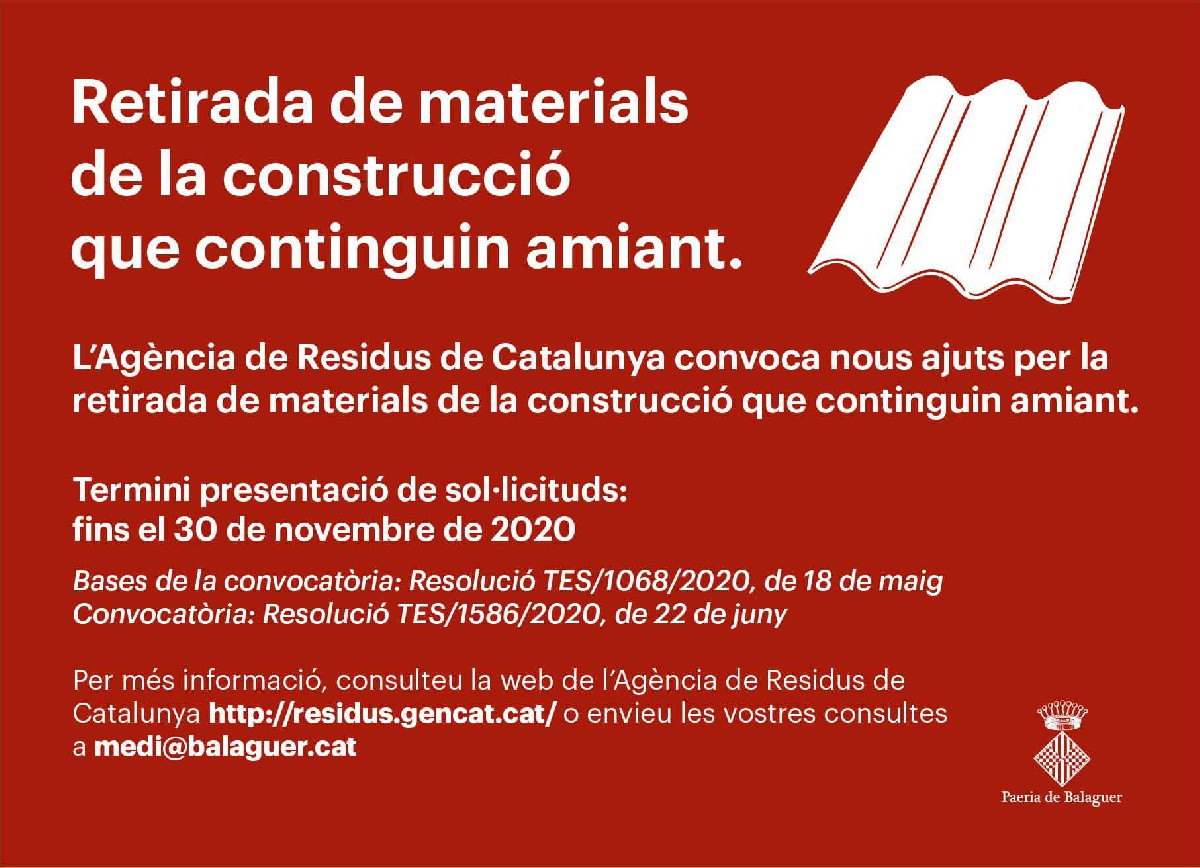 L'Agència de Residus de Catalunya convoca ajuts per retirar amiant dels edificis. Se'n poden beneficiar les persones propietàries dels edificis que continguin amiant i que l'hagin de traure.