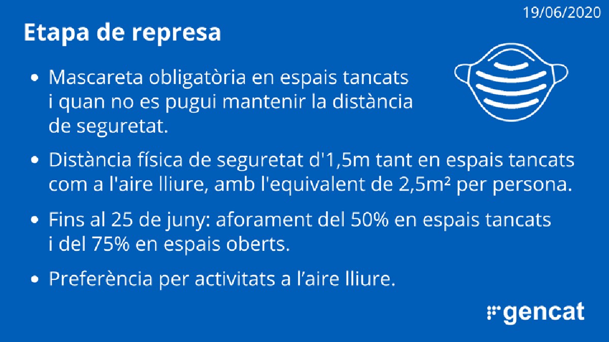 Aquesta mitja nit s'acaben els límits d'aforaments i la distància de seguretat passa a ser la norma general en espais tancats i oberts. S'haurà de garantir una superfície de 2,5 metres quadrats per persona