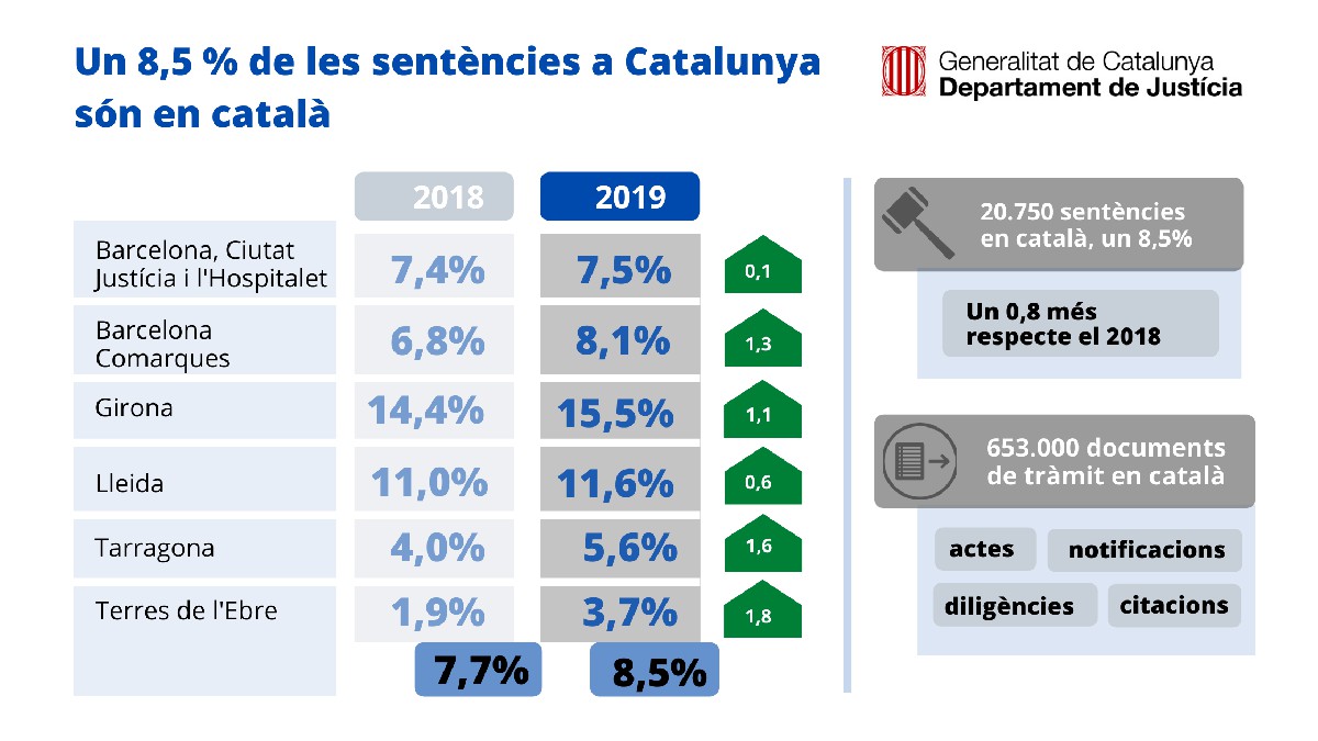Les sentències en català es mantenen per sota del 9 % per cinquè any consecutiu. La demarcació de Girona continua tenint el major percentatge de sentències escrites en català amb un 15,5 %, seguida de Lleida, amb un 11,6 %.