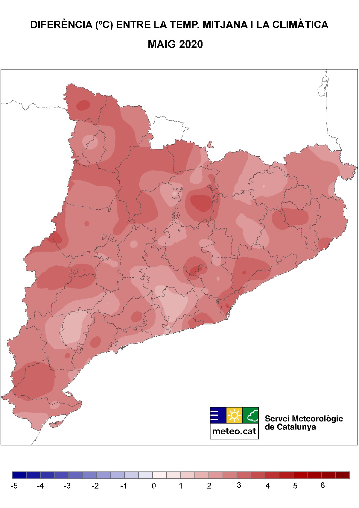El mes de maig ha estat càlid a Catalunya. El mes es pot qualificar de càlid a gran part de Catalunya, i molt càlid a punts del litoral Central, Prelitoral, de la plana de Lleida, Prepirineu i Pirineu