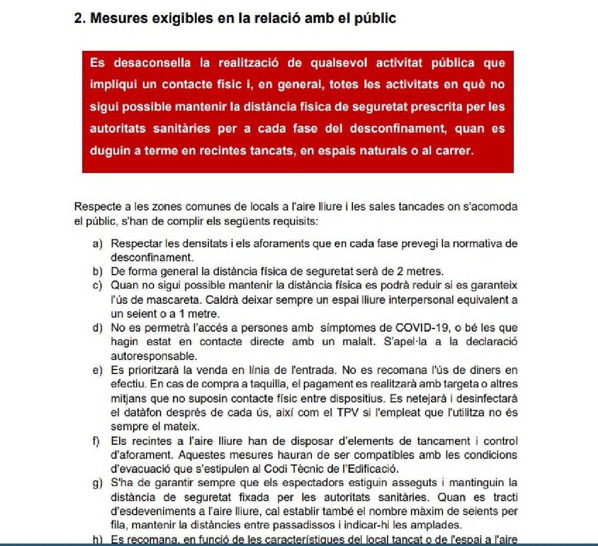El Departament de Cultura publica les condicions per fer actes culturals amb públic en locals i a l'aire lliure. La distància física de seguretat, la protecció dels treballadors i la supervisió de les activitats per part dels ajuntaments