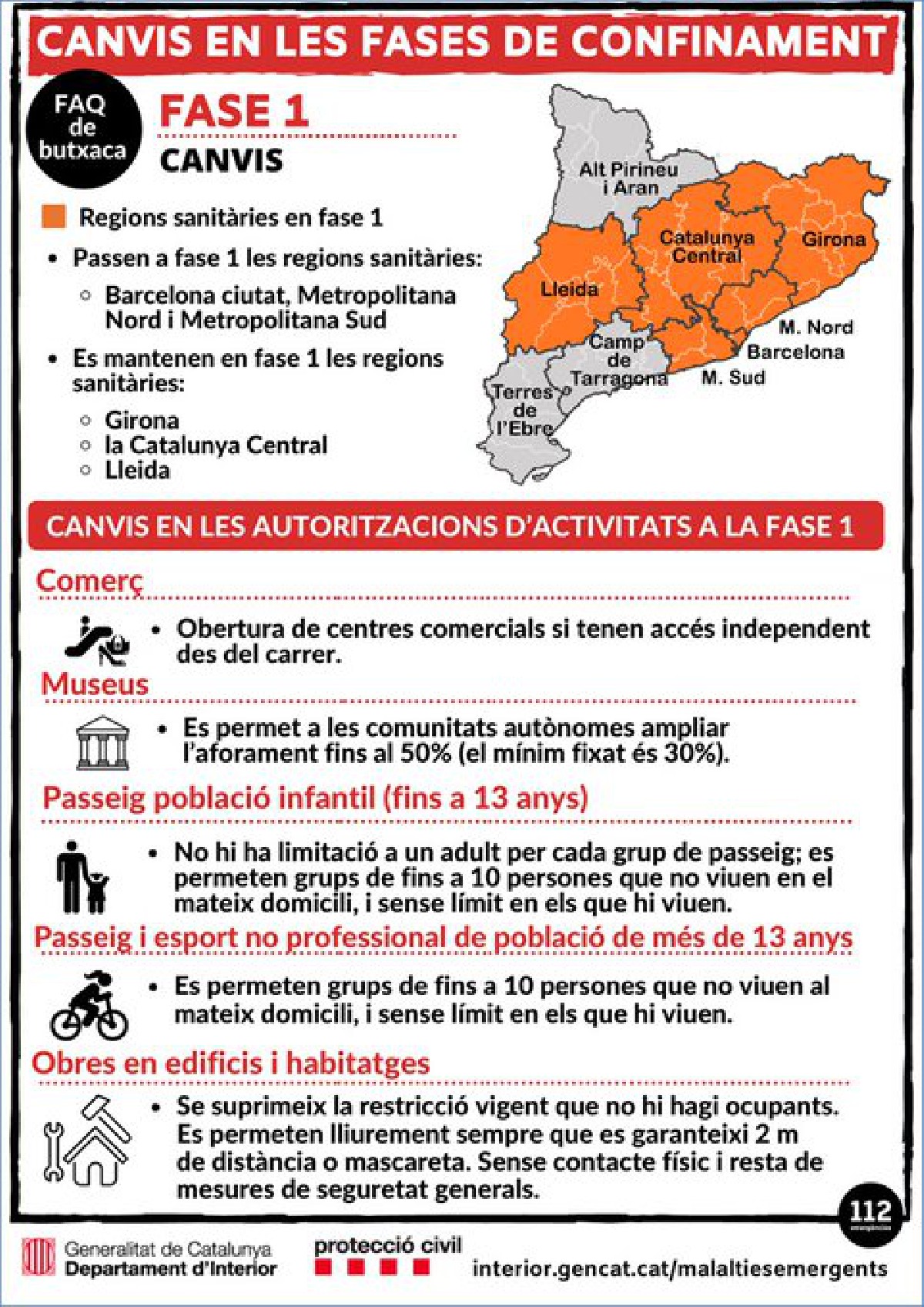 Aquest dilluns Barcelona i àrea metropolitana passen a fase 1 i Camp de Tarragona, Alt Pirineu i Aran i Terres de l'Ebre avancen a la 2. La resta de Catalunya es manté en fase 1