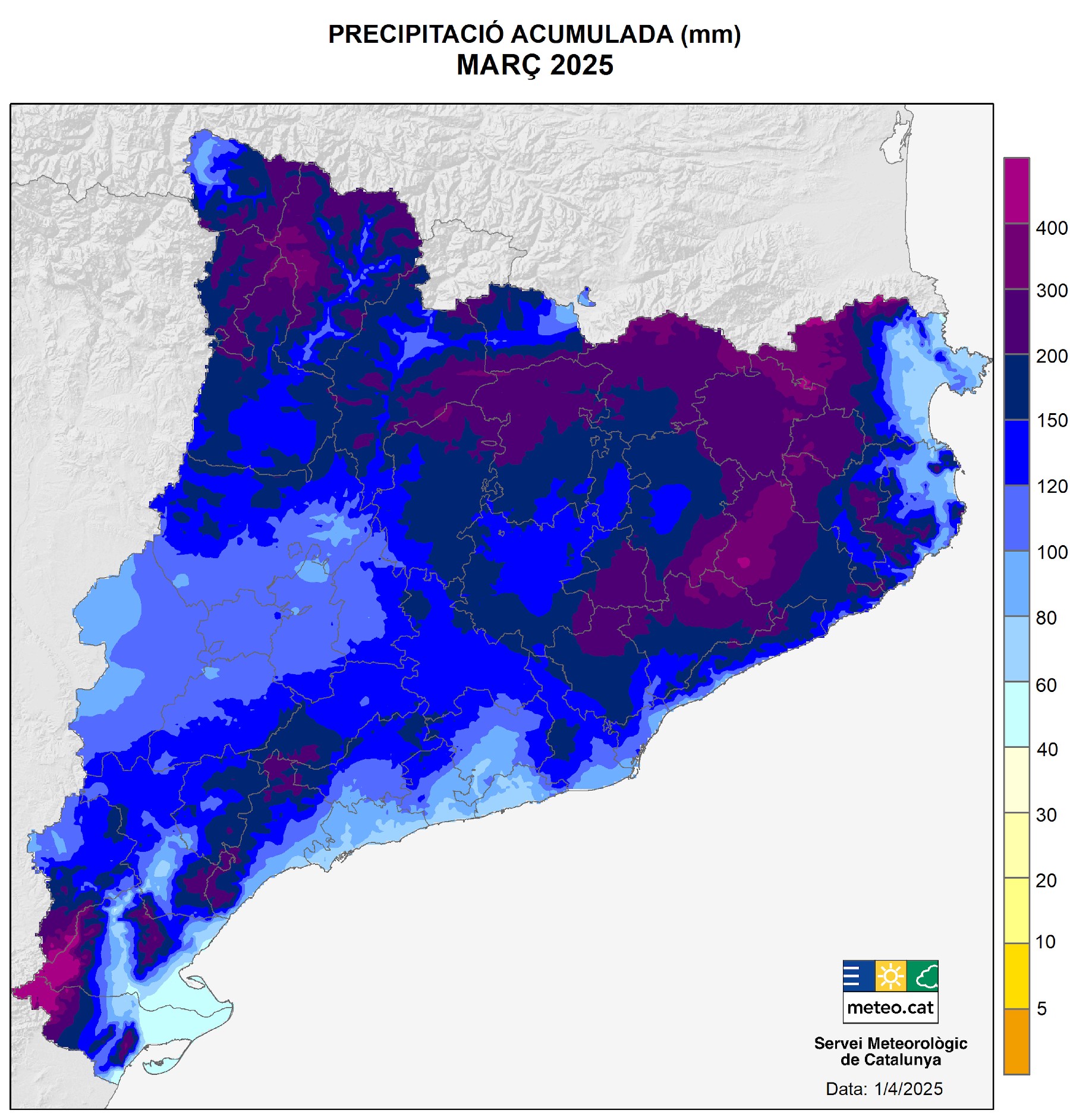 Aquest març ha estat el més plujós des de principis de segle. La temperatura i la insolació han estat més baixes de l'habitual per a l'època per la nuvolositat