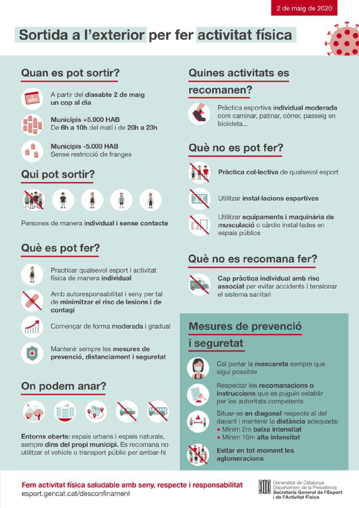 A partir d'aquest dissabte ja es podrà sortir a practicar esport a l'aire lliure. La Secretaria General de l'Esport i de l'Activitat Física publica una guia de recomanacions i normativa per poder-lo practicar de forma segura