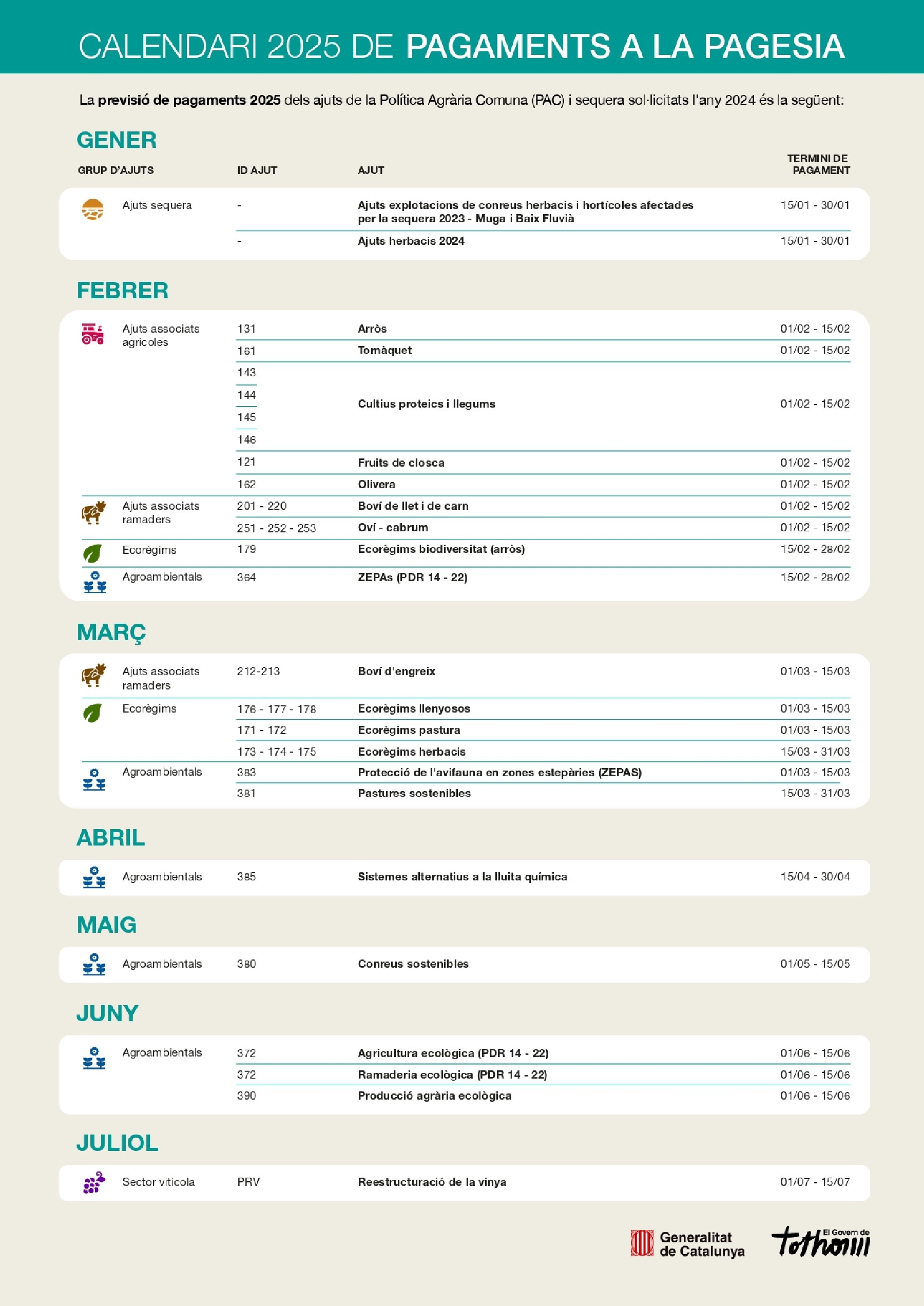 El Departament d'Agricultura publica el calendari de pagaments a la pagesia. El calendari de pagaments era una demanda compartida del sector agroalimentari