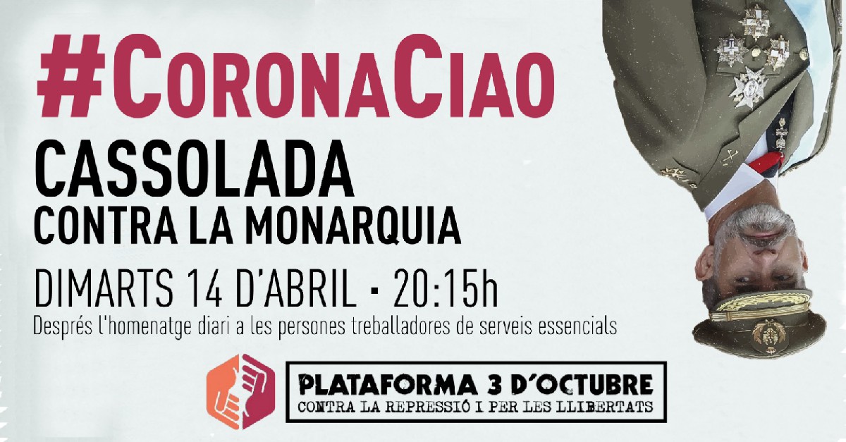 La Plataforma 3 d'Octubre convoca una cassolada contra la monarquia aquest dimarts a les 20.15 h. Amb motiu del dia de la República, l'organització reclama l'abolició del règim monàrquic