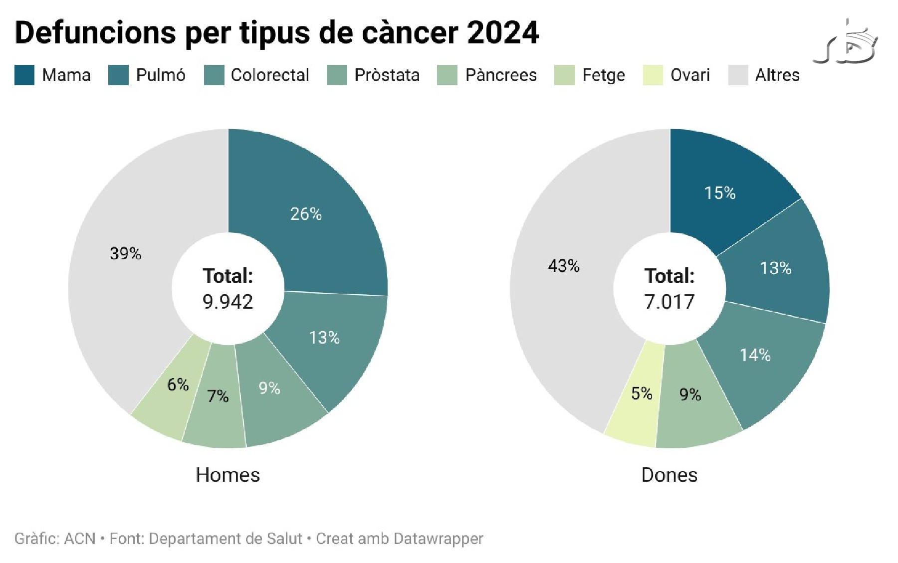 S'estima que s'han diagnosticat 42.851 tumors malignes a Catalunya el 2024, 24.293 en homes i 18.558 en dones. Salut calcula que es van produir prop de 17.000 defuncions per càncer el mateix any