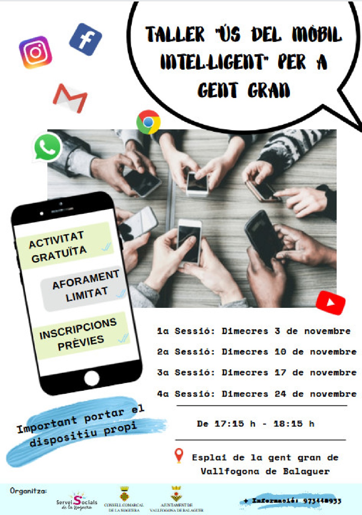 L'àrea de Serveis Socials del Consell Comarcal de la Noguera ha programat el taller "Ús del mòbil intel·ligent" adreçat a les persones grans de la comarca per ensenyar-los el funcionament d'aquests aparells per tal que puguin aprofitar-ne totes les prestacions i avantatges que ofereixen.
