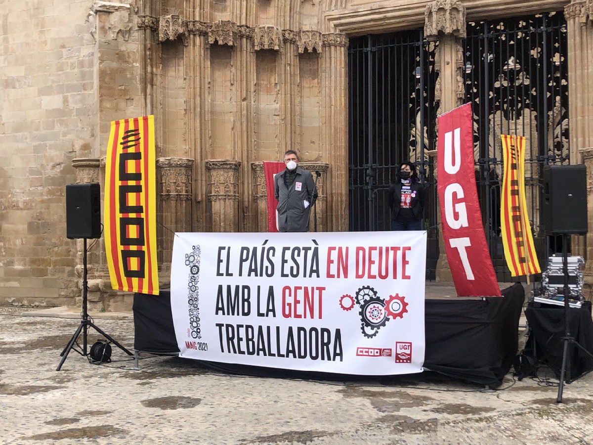 Lleida ha viscut un nou Primer de Maig al carrer. Després de més d'un any llarg de pandèmia, els sindicats UGT-Terres de Lleida i CCOO Lleida han volgut tornar als carrers de la ciutat, i aquest dissabte han celebrat una concentració estàtica davant de la Porta dels Apòstols de la Seu Vella per exigir responsabilitats a les administracions i a les empreses.