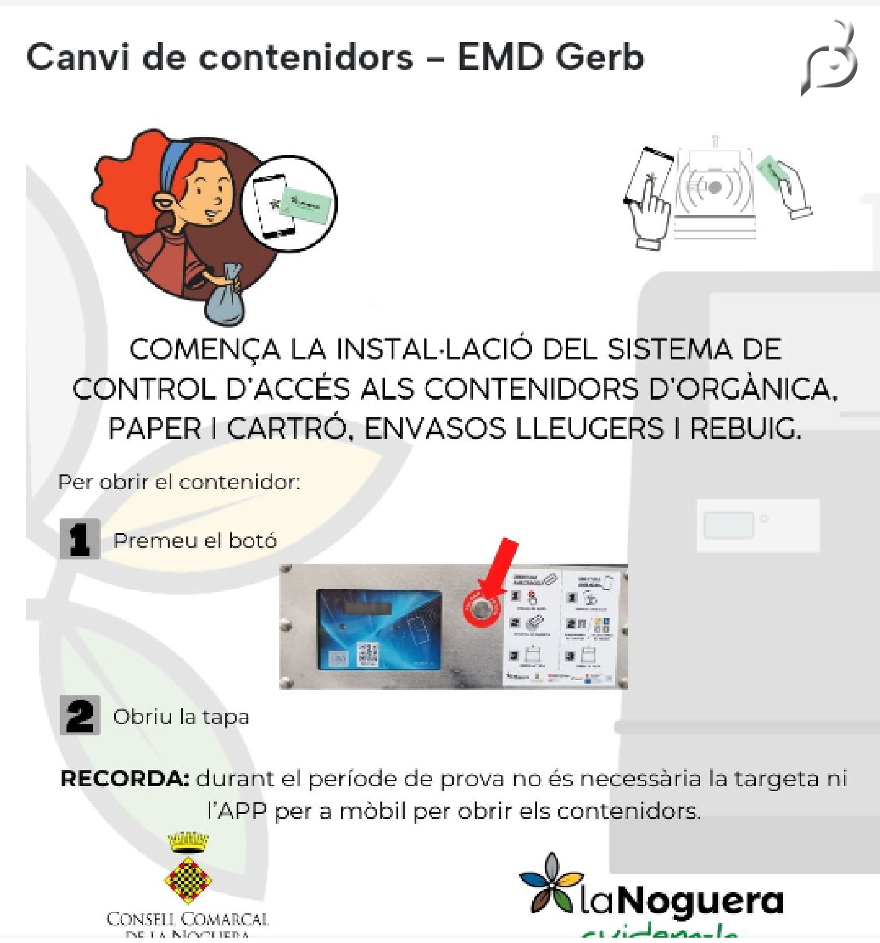 El Consell Comarcal de la Noguera continua amb el desplegament dels nous contenidors intel·ligents. Els darrers s'han instal·lat aquesta setmana passada a Gerb. El nou sistema funcionarà amb targeta identificativa o amb una aplicació mòbil, per a poder obrir els contenidors. De moment però el sistema estarà en període de proves i només caldrà prémer el botó situat panell de lectura de targetes per obrir el contenidor. Prèviament es van fer xerrades informatives i l'entrega de les targetes al veïns, amés d'un codi d'accés a l'APP per habitatge.
