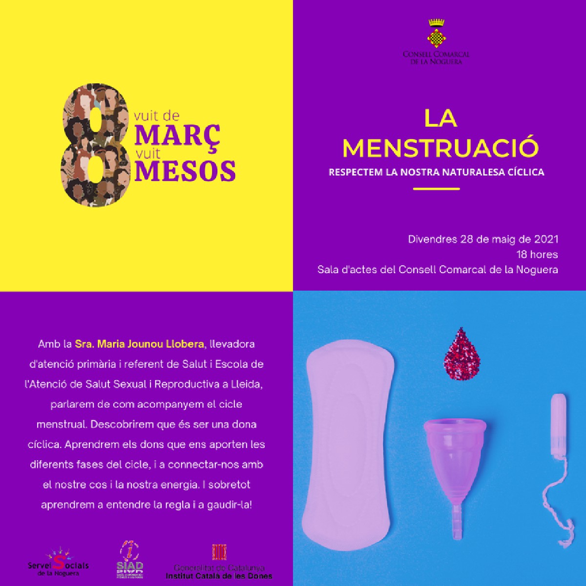 El divendres 28 de maig de 2021, a les 18.000, tindrà lloc la xerrada "La menstruació. Respectem la nostra naturalesa cíclica" a càrrec de Maria Jounou Llobera, llevadora d'atenció primària i referent de Salut i Escola de l'Atenció de Salut Sexual i Reproductiva a Lleida.
