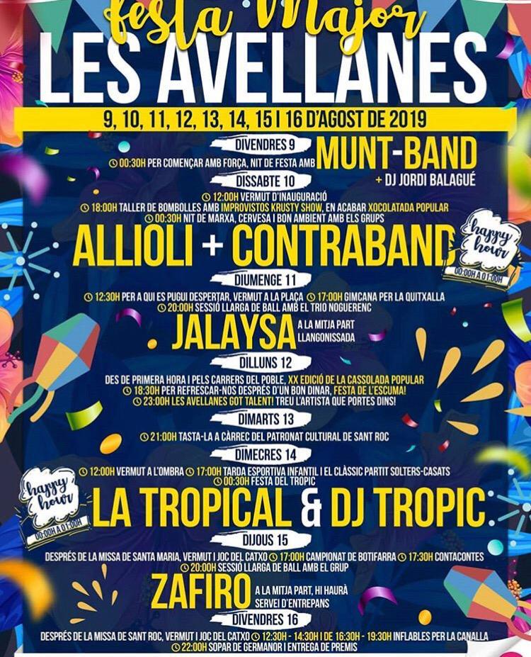 Aquest cap de setmana passat el municipi de Les Avellanes ha començat ha celebrar la seva festa major. En destaca la festa jove divendres passat amb el grup Munt Band i la sessió del dj Jordi Balagué. Dissabte hi van actuarar Allioli i Contraband, i diumenge ball amb Jalaysa. D'aquesta setmana destaca per exemple per avui dilluns una festa de l'escuma durant la tarda i al vespre Les Avellanes Got Talent, amb un concurs de talents. dimecres dia 14 més música amb La tropical i dj Tropic i dijous ball amb Zafiro. Tots els dies també es faran diferents activitats per a tothom com una cassolada popular, activitats per la mainada, actuacions dels talents del poble, un concurs de botifarra o partits de futbol.