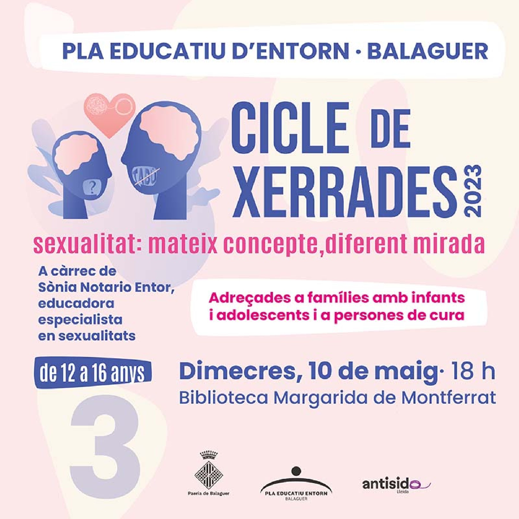 La d'avui serà la darrera de les tres xerrades que s'han organitzat. Compta amb el suport de la biblioteca Municipal de Balaguer que ha elaborat la guia 'Creixem llegint de sexualitat' i amb la col·laboració de la comissió de famílies del Pla Educatiu d'Entorn.