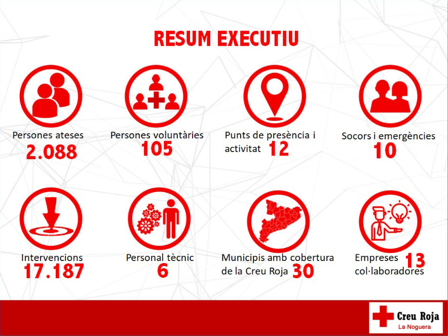 També s'ha destacat que la manera de fer possible aquest alt nombre d'intervencions és gràcies a la força del voluntariat. Així doncs, Creu Roja a la Noguera compta només amb 6 persones tècniques però amb la força de 105 voluntaris i 13 empreses col•laboradores.