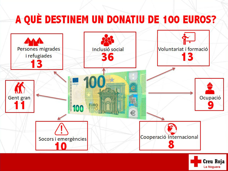 Finalment, durant la presentació s'ha explicat com reparteix l'entitat un donatiu econòmic. S'ha fet amb un diagrama on es pot veure les diferents branques a les que es destinen recursos econòmics, sent de més a menys recursos la inclusió social, el voluntariat i la formació, les persones migrades i refugiades, la gent gran, els socors i emergències, la ocupació i la cooperació internacional. D'aquestes branques en destaca la d'Inclusió social, a la que es destina el 36% dels donatius.