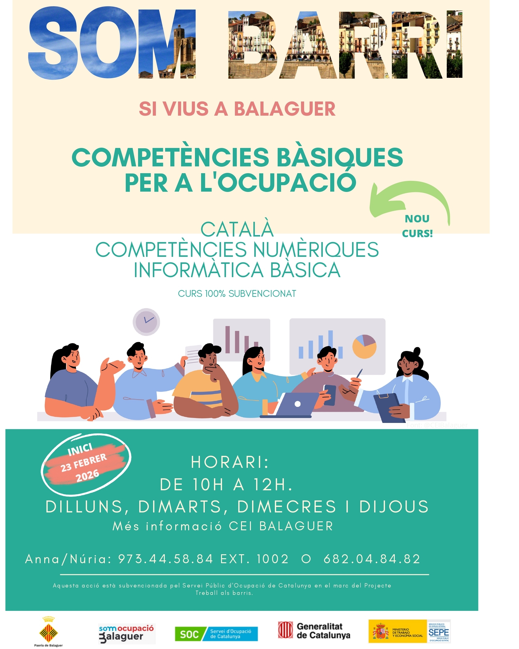 El pròxim 23 de febrer es posarà en marxa una nova edició del curs de Competències bàsiques per a l’ocupació, emmarcat en la nova convocatòria del Projecte Treball als Barris 2025. La formació, que s’impartirà a les instal·lacions del CEI de Balaguer, tindrà una durada de vuit mesos i es desenvoluparà en horari de dilluns a dijous, de 10 h a 12 h.
