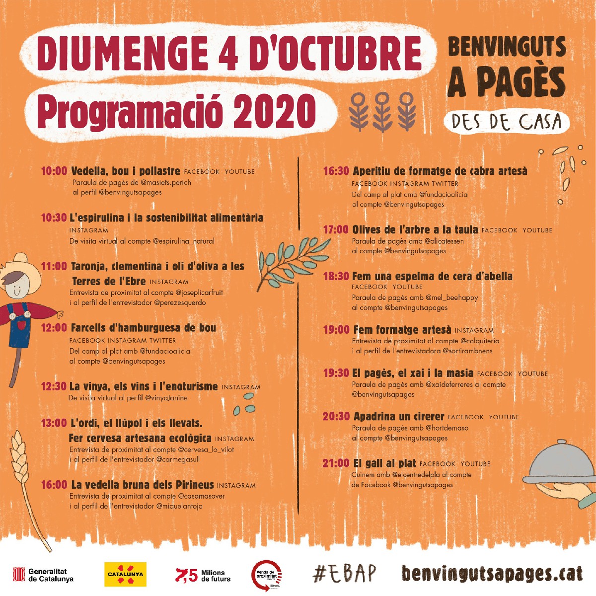 A través dels perfils de Benvinguts a Pagès a les xarxes socials, els dies 3 i 4 d'octubre es podrà conèixer el dia a dia de diferents pagesos i pageses que seran entrevistats i explicaran, entre altres qüestions, com és l'elaboració de l'oli a les Terres de l'Ebre, els secrets de la producció d'un producte com la cervesa des de Lleida, o el treball a l'horta amb productes dolços al Berguedà.